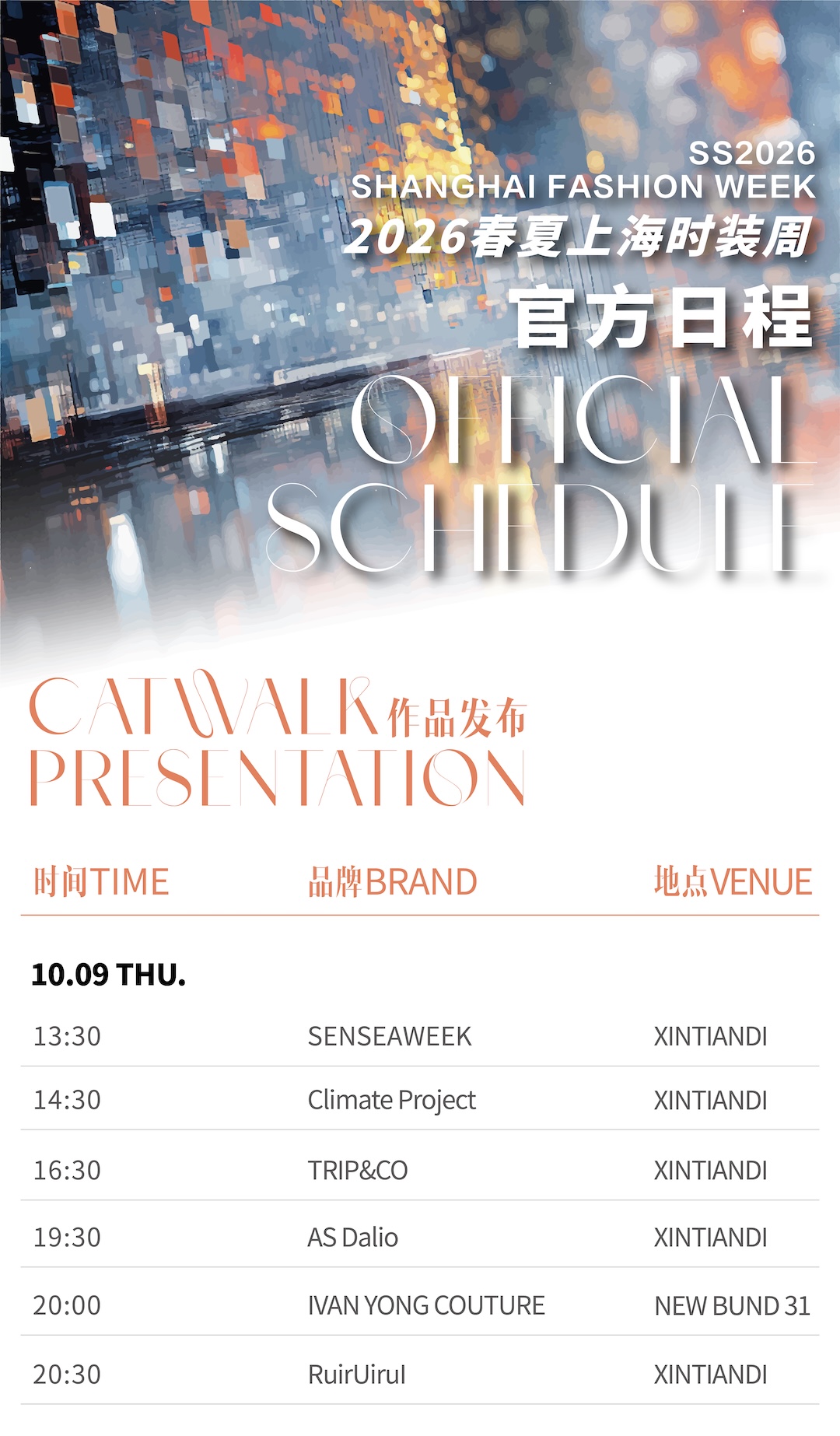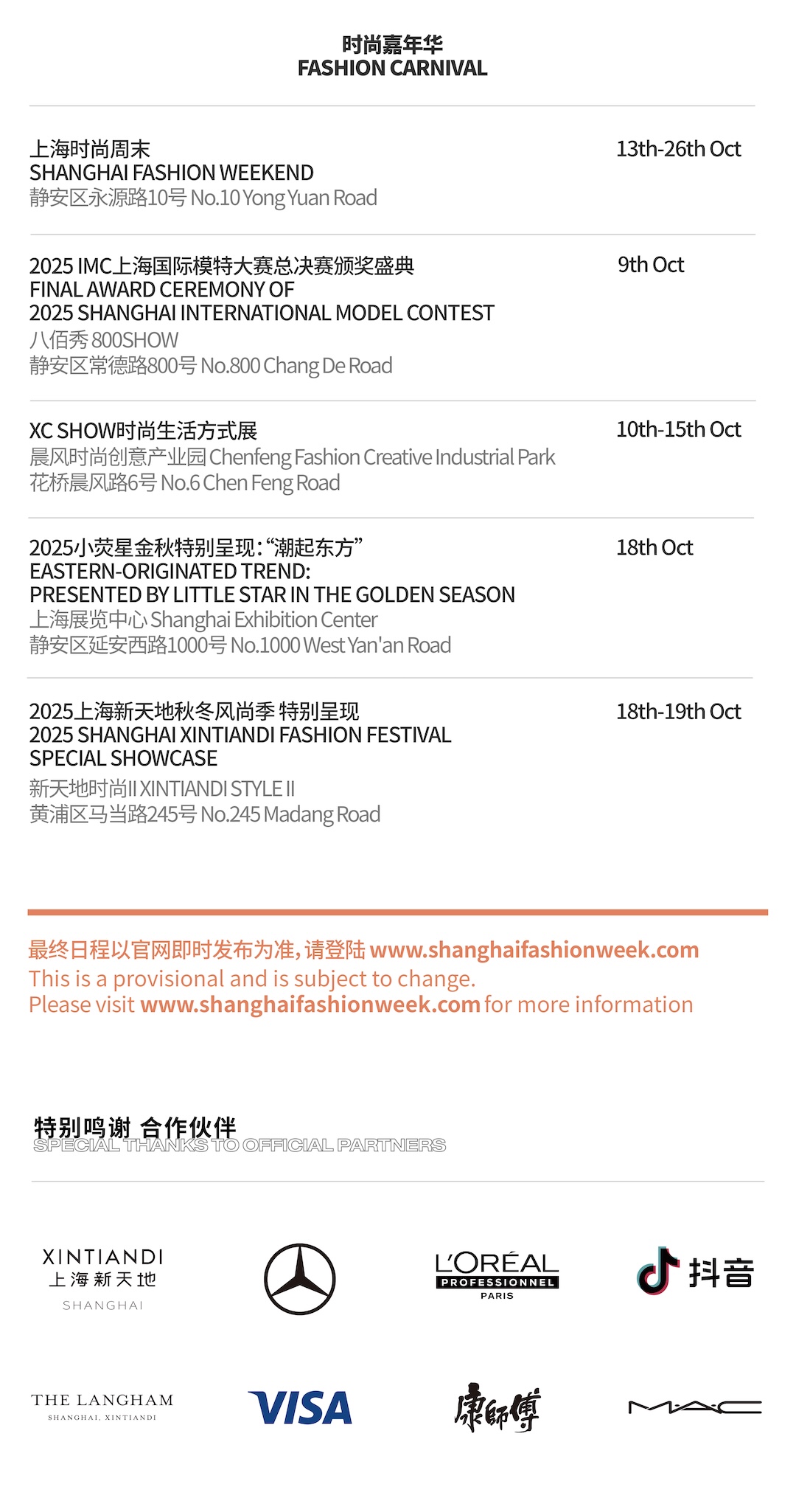 上海时装周的成功举办离不开合作伙伴的鼎力支持,感谢来自上海新天地、梅赛德斯-奔驰、欧莱雅PRO、抖音、上海新天地朗廷酒店、Visa、康师傅、M·A·C魅可的赞助支持,以及《服饰与美容VOGUE》、《ELLE世界时装之苑》、《ELLEMEN睿士》、《InStyle优家画报》、腾讯视频、微博时尚的报道支持。2026春夏上海时装周趋势主题由全球趋势机构Promostyl提供参考,主视觉画面由国际知名专业彩妆品牌M·A·C魅可团队特别结合AI技术创意呈现。结合主题创意设计的时装周宣传画面也将在“外滩之窗”、震旦国际大楼、香港广场等地标大屏精彩呈现。
