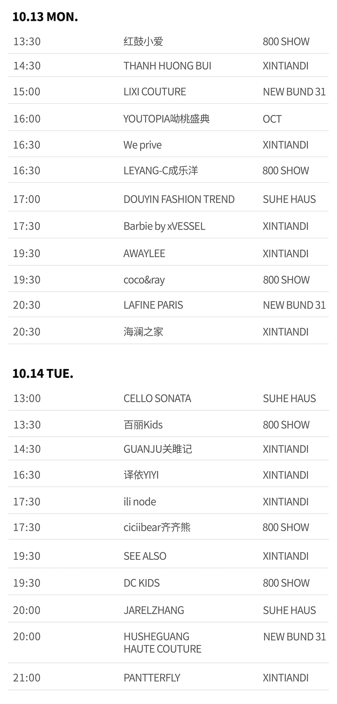 主秀场之外,本季时装周继续稳固构建多元发布矩阵,LABELHOOD先锋时装艺术节将于苏河皓司、华侨城苏河湾迎来第20季发布活动,持续为中国独立设计师提供展示与发声的重要平台;GLAM特色时尚发布在前滩31打造社交礼服特色时尚秀场;KIDSWEAR则在800秀上演儿童时尚专场。
