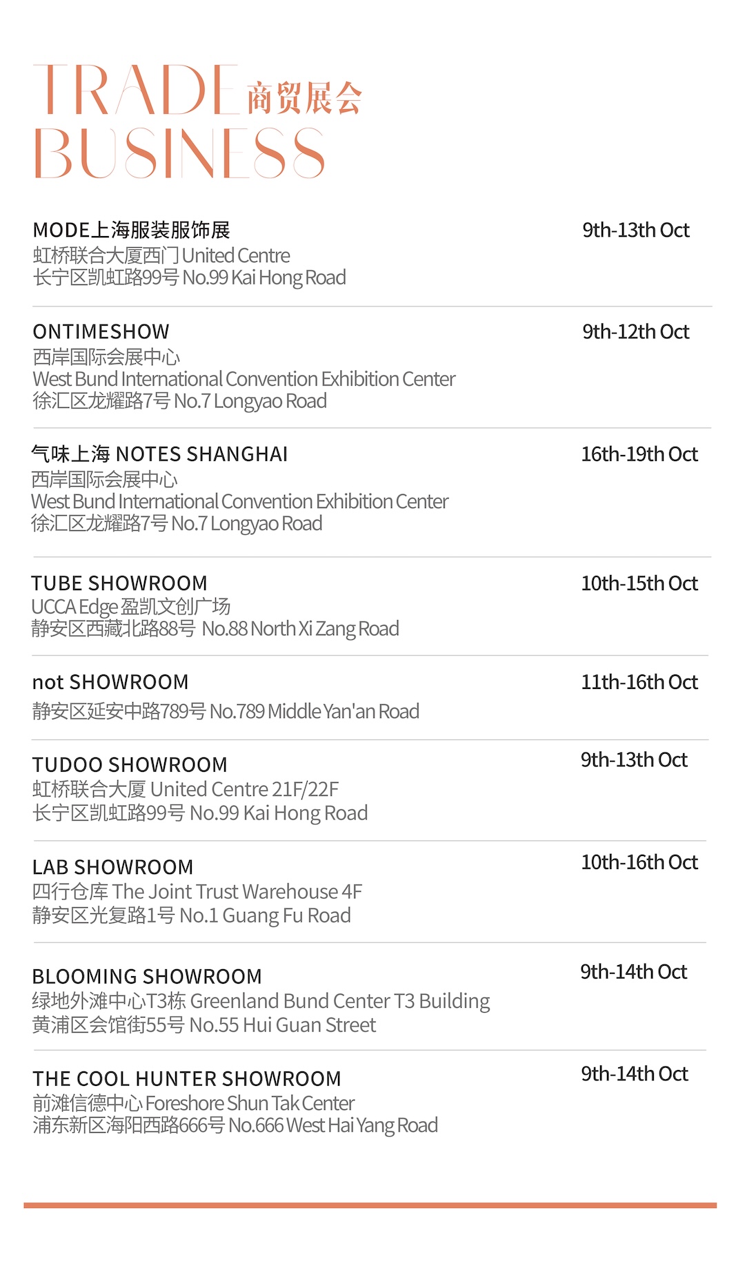 上海时装周持续强化平台功能,致力于打造原创服装服饰“亚洲最大订货季”,除MODE展外,ONTIMESHOW、TUBE SHOWROOM、not SHOWROOM、TUDOO SHOWROOM和LAB SHOWROOM等订货会再度集结亮相。上一季新加入的气味上海Notes Shanghai本季将登陆上海西岸国际会展中心,汇聚来自世界各地的优质香水与香氛品牌。BLOOMING SHOWROOM与THE COOL HUNTER SHOWROOM也将以更大规模和更优阵容持续为时装周订货季注入专业力量。